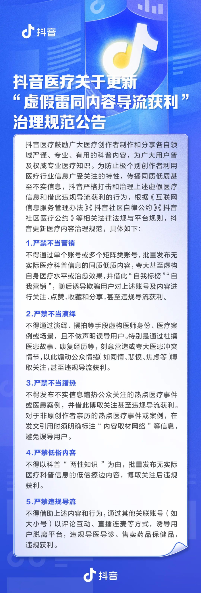 医疗健康关乎生命,为避免对用户造成伤害、误导,抖音医疗持续严格治理违法违规言行,发布新规,从严治理“虚假雷同内容导流获利”。新规明确要求“不得夸大甚至虚构自身医疗水平,打造‘神医’‘名医’人设诱导欺骗用户,违规获利”“不得通过杜撰医患矛盾,刻意营造或夸大医患冲突等同质低质甚至不实信息,以此煽动公众情绪(如同情、悲愤、焦虑等)博取关注,甚至违规导流获利”等。