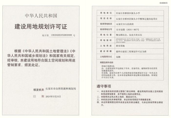 5月24日,石家庄市自然资源规划局发布桥西区振头小学整体迁建改造项目建筑用地规划许可证。