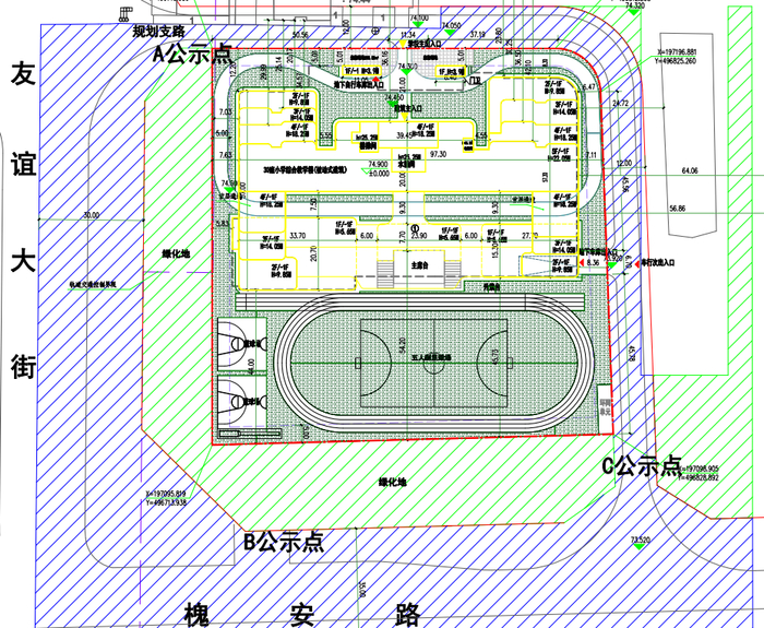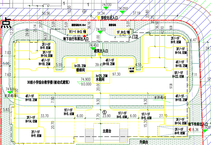 项目总平面图中黄色框线内为规划建筑,由此可见,该项目规划建设30班小学综合教学楼。