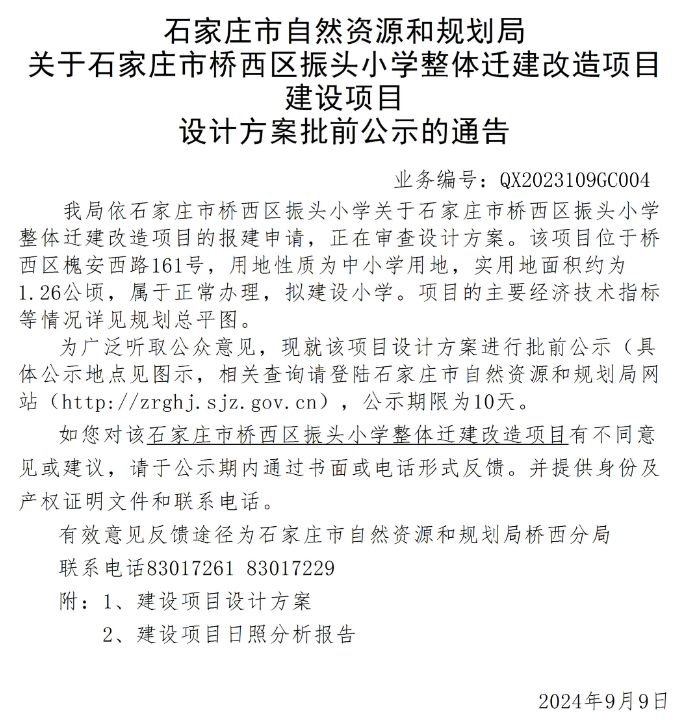 9月9日,石家庄市自然资源和规划局网站最新发布关于石家庄市桥西区振头小学整体迁建改造项目设计方案批前公示的通告,公示期限为10天。