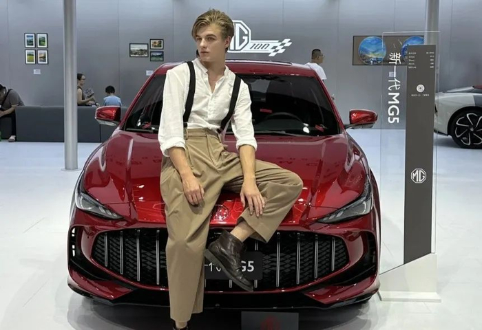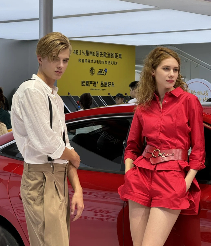 相比于那位模特,他身侧那款名爵跑车才是现场纸醉金迷氛围感的核心源头。