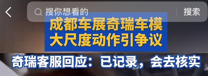 有观众向品牌方奇瑞抗议,表示车展里许多观众是家庭出行、现场有不少小孩子,做大尺度动作不太好。