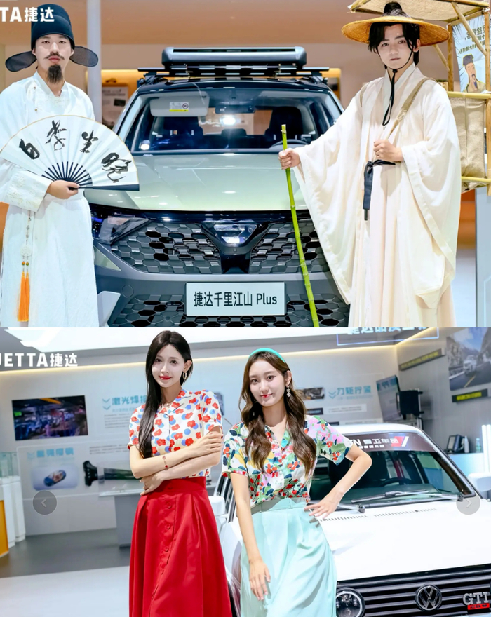 捷达给旗下以千里江山命名的新款车型配了两位古装造型车模。