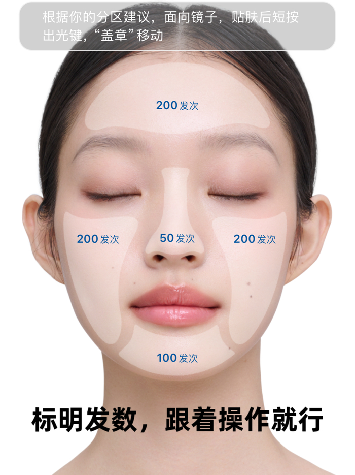(1)一键光学测肤,定制护理计划:它能免费帮你测试皮肤状态,根据肌肤情况,制定专属于你的护理计划,并且细致地将面部划分为 5 个区域,精准定制每个部位的发数;