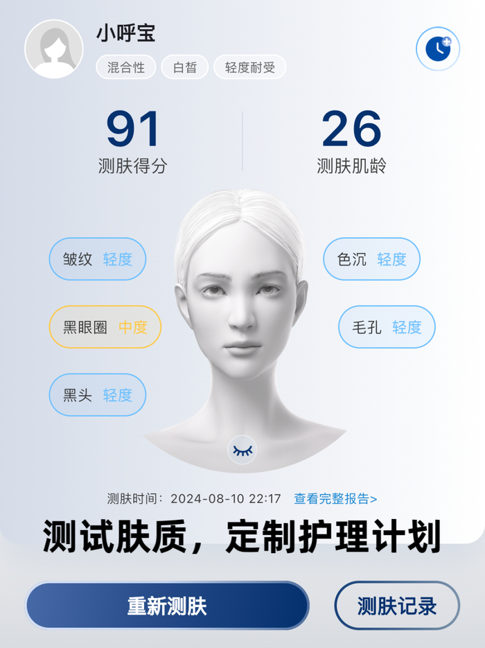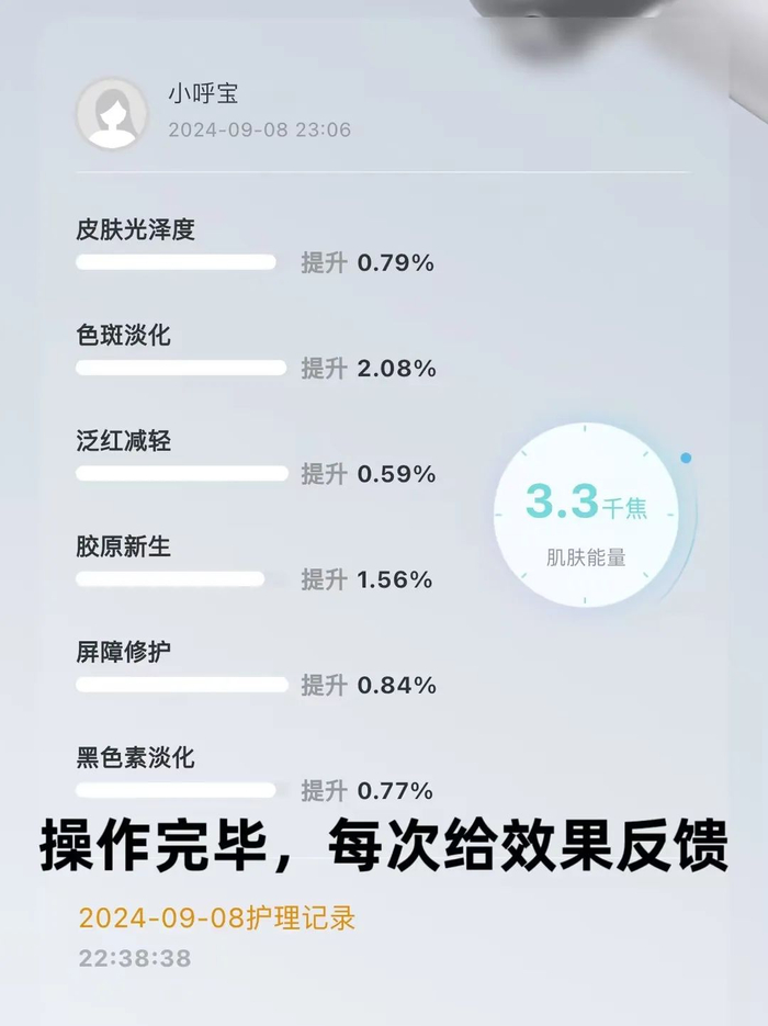 (3)及时给到反馈:做完了以后,它会根据你的皮肤情况,给到你面部状态的数据反馈,有效果更能坚持。