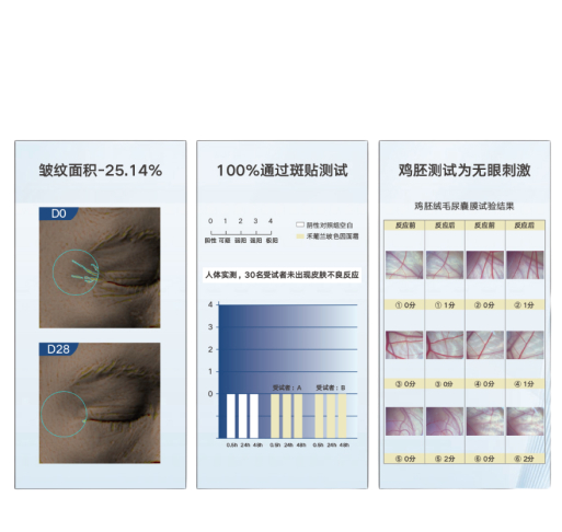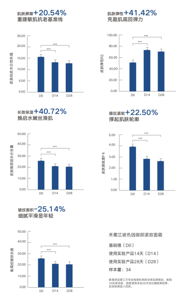 通过权威机构检测,使用玻色因面霜28天后,肌肤面部皱纹面积-25.14%,提拉紧致+22.5%,肌肤弹性+41.41%,肌肤水分+40.72%,其卓越功效得到了充分验证。
