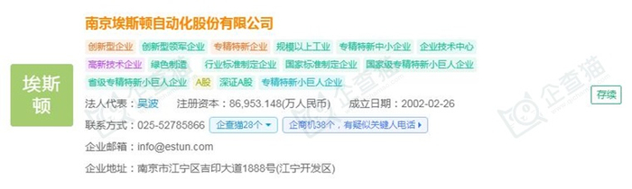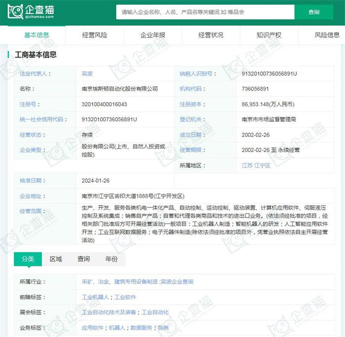 据企查猫显示,南京埃斯顿自动化股份有限公司成立于2002年02月26日,注册资本86,953.148万人民币,法定代表人吴波,公司经营范围包括:生产、开发、服务各类机电一体化产品、自动控制、运动控制、驱动装置、计算机应用软件、伺服液压控制及系统集成;销售自产产品;自营和代理各类商品和技术的进出口业务。(依法须经批准的项目,经相关部门批准后方可开展经营活动)一般项目:工业机器人制造;智能机器人的研发;人工智能应用软件开发;工业互联网数据服务;电子元器件制造(除依法须经批准的项目外,凭营业执照依法自主开展经营活动)