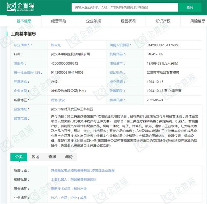 据企查猫显示,武汉华中数控股份有限公司成立于1994年10月18日,注册资本19,869.691万人民币,法定代表人陈吉红,公司经营范围包括:一般项目:第二类医疗器械销售;数控系统、机器人、智能生产线、新能源汽车设计和配套产品、机电一体化、电子、计算机、激光、通信、工业软件、红外等技术及产品的开发、研制、生产、技术服务等。