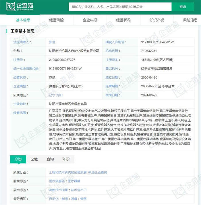 据企查猫显示,沈阳新松机器人自动化股份有限公司成立于2000年04月30日,注册资本156,561.995万人民币,法定代表人张进,公司经营范围包括:一般项目:工业机器人制造,工业机器人销售,智能机器人的研发,智能机器人销售,特殊作业机器人制造,物料搬运装备制造,智能仓储装备销售,核电设备成套及工程技术研发,软件开发,人工智能应用软件开发等。