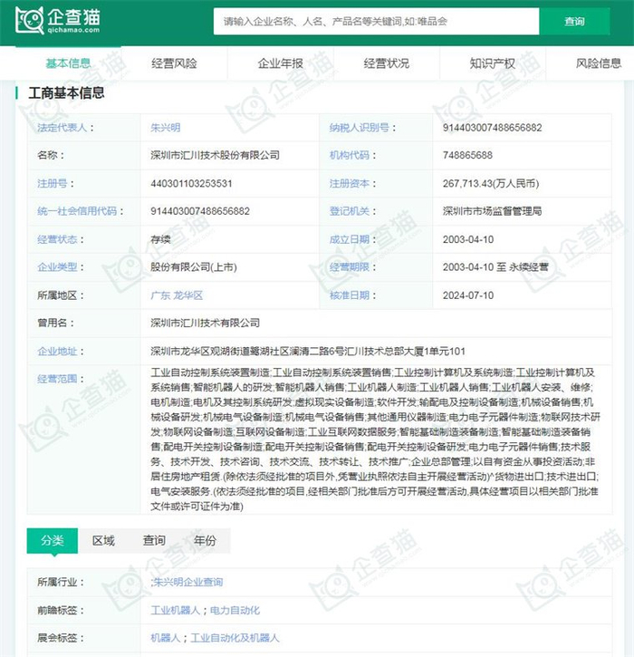 据企查猫显示,深圳市汇川技术股份有限公司成立于2003年04月10日,注册资本267,713.43万人民币,法定代表人朱兴明,公司经营范围包括:工业自动控制系统装置制造;工业自动控制系统装置销售;工业控制计算机及系统制造;工业控制计算机及系统销售;智能机器人的研发;智能机器人销售;工业机器人制造;工业机器人销售;工业机器人安装、维修;电机制造等。