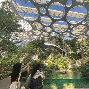 “海市沙洲”以“变异的叶”为主题,无论是有着圆鼓鼓“肚皮”的昆士兰瓶树,还是巨大的猴面包树,抑或是具有刺状叶、肉质叶、膨大茎等沙洲植物,都令人叹为观止。“云上森林”以“会呼吸的根”为主题,游客可探寻板根、支柱根、气生根等雨林奇观。“云雾峡谷”以“空中的花”为主题,在空中花园、棕榈花溪、幽峡寻兰、云栖花谷四大景观空间,游客可以观赏地生的花、树上的花、空中的花。值得一提的是,连接展馆的通道就在中心湖底,天花板全透明,穿越时头顶就是湖水和小鱼。