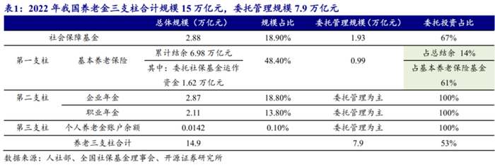 (1)养老金规模及结构:2022年末养老金一二支柱分别10/5万亿元,占三支柱比重超90%,第三支柱账户+产品制合计约万亿元,未来入市空间长远。