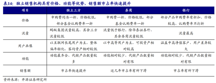 2017-2019年,扣掉直销渠道后,银行和券商市场份额分别下滑10.9/8.5个百分点,独立三方机构提升20.2个百分点。移动互联网趋势下,互联网三方机构不断抢占传统金融机构的市场份额,依靠流量、便捷、低价等优势,互联网三方市占率有望持续提升;头部券商具有投顾和专业化优势,目前部分券商转变考核机制,将产品保有规模、客户满意度、客户产品覆盖率等指标纳入绩效考核,未来在财富管理转型及基金投顾试点下券商市场份额有望实现提升;银行用户分化较大,在基金销售中占据认购渠道,头部银行有望把握高净值用户,保持市占率稳定。