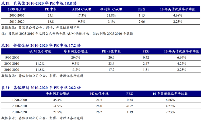 从海外资产管理公司估值看,P/AUM差距较大,主要由于各家上市资管公司业务结构差异较大,而PE估值相对稳定。美国1980年-2000年共同基金25%CAGR,海外AUM前五的上市资管龙头平均PEG估值2倍。