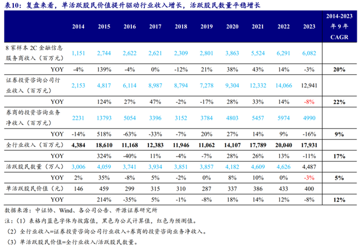 (3)受益于供需两端升级,行业渗透率有所提升。机构化、股民专业化趋势凸显,全市场单活跃股民价值有所提升,预计主要由付费转化率提升驱动,未来核心关注beta弹性。