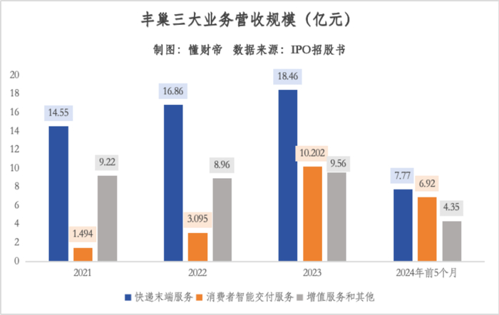 正因此,在快递末端服务、增值服务和其他业务增长缓慢的情况下,丰巢仍实现了较快增长。2021-2023年,总收入分别为25.3亿元、28.9亿元、38.1亿元,2024年前5个月,总收入为19.04亿元。