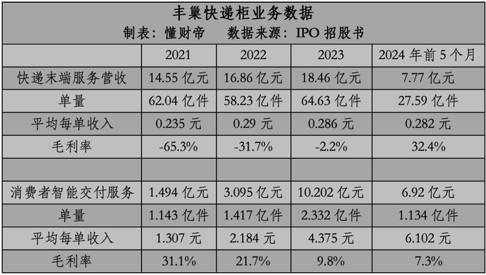 经营数据显示,2021-2023年,2024年前5个月,丰巢快递柜存件的单票平均收入分别为0.235元、0.29元、0.286元、0.282元。