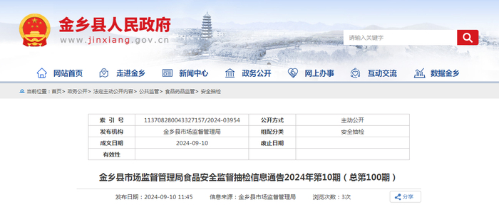 金乡县市场监督管理局食品安全监督抽检信息通告2024年第10期(总第100期)