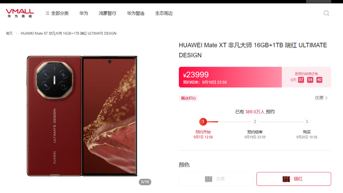 定价方面,华为Mate XT产品售价19999元起,最低配置为16GB+256GB,顶配版为16GB+1TB,售价23999元,9月7日起已开启预订,9月20日10:08正式开售。