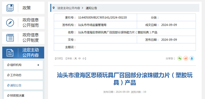 汕头市澄海区思硕玩具厂召回部分滚珠磁力片(塑胶玩具)产品