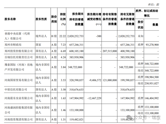 瑞财经发现,郑州银行前10大普通股股东,依然存在不少存在质押、冻结股份的情况。截至2024年6月30日,郑州市财政局质押郑州银行9327.89万股,占总持股数约14%;河南国原贸易质押郑州银行1.98亿股、冻结2.3亿股;河南晨东实业有限公司质押郑州银行1.46亿股。