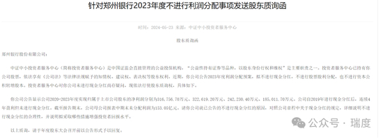 最近,郑州银行甚至因为“不分红”收到了中小投资者服务中心的《股东质询函》。