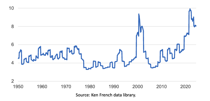 可以看到,从1950年到2000年大约50年中,估值差距一直处于一个相对稳定的区间,在3倍到6倍之间徘徊。之后在1999至2000年的互联网泡沫中,这一比值达到了前所未有的高度——9.5倍。也就是说贵的股票变得更贵,而便宜的股票被人遗弃。这是史无前例的。
