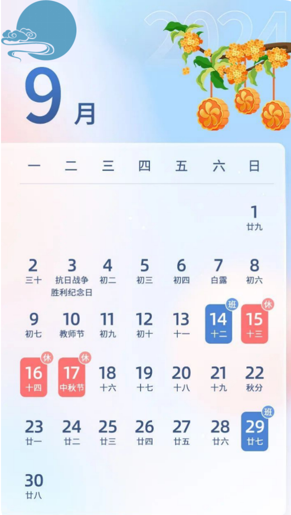 2024年中秋放假时间为9月15日至17日放假调休(9月14日周六上班),共3天;