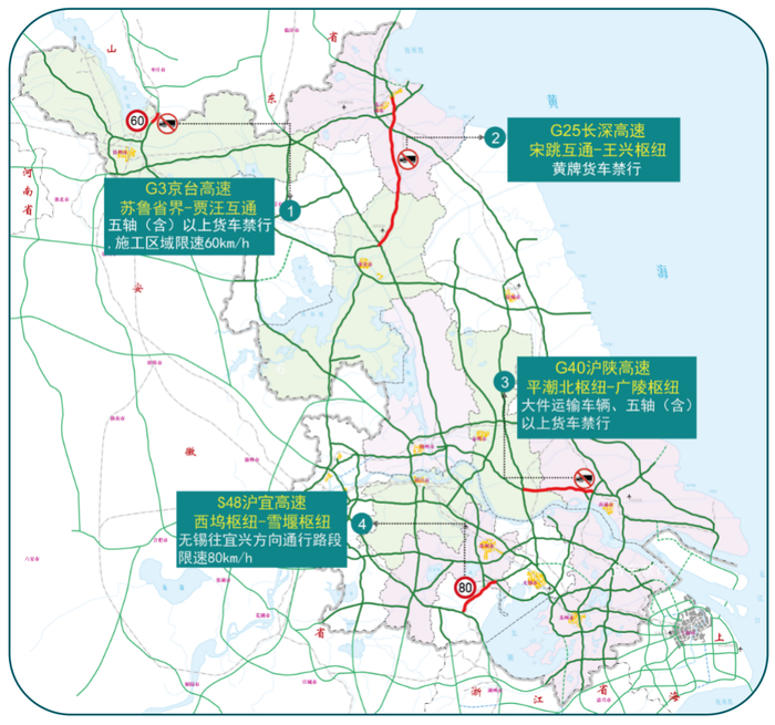 中秋期间,江苏高速对危化品运输车全路网全时段禁行。另外,部分重要路段、节点实施交通管控政策,相关车辆假日期间提前绕行,请勿驶入限行路段。