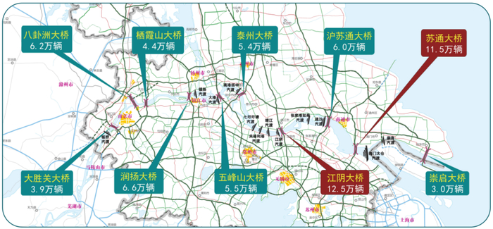 中秋期间,全省10座高速公路过江通道首日早高峰单向通行压力较大,日均过江流量预计为65.0万辆,较平日增长约25%。随着五峰山大桥、燕子矶过江隧道的通车运营,过江通道流量分布更加均衡,但江阴大桥、苏通大桥交通流量依然较大。