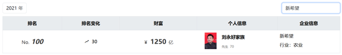 《胡润全球富豪榜》显示,2021年时,刘永好家族的财富达到1250亿元,正好位列全球富豪榜的第100位;2022年时,进一步上升到第93位。