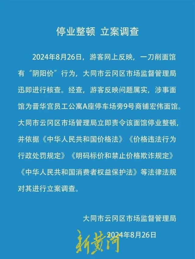 事后,山西大同当地市监局通报称,游客反映问题属实,立即责令该面馆停业整顿,并依据相关法律法规对该面馆进行立案调查。有媒体采访涉事面馆店主时,其解释称,该店一碗面的价格普遍就是7元至8元,这次是服务员不小心把价格算错了,并不是“阴阳价”,“这两天鸡蛋贵了,所以是2元,多收了他们6元,也已经退给他们了。”