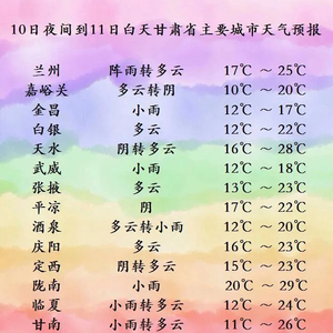 明天夜间到后天白天(9月11日20时-9月12日20时),张掖、金昌、武威三市阴有小到中雨,局部地方有大雨;酒泉、嘉峪关、兰州、白银、临夏、甘南、陇南等市州阴有小雨,局部地方有中雨;省内其余地方多云间阴,部分地方有小雨或阵雨。