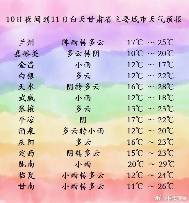 今天夜间到明天白天(9月10日20时-9月11日20时),酒泉、嘉峪关两市多云转阴,局部地方有小雨或阵雨;张掖、金昌、武威、陇南等市及兰州、白银两市北部阴有小雨,局部地方有中雨;省内其余地方多云间阴,部分地方有阵雨或小雨。另外,酒泉市有5-6级偏东风,陇南、天水两市及平凉市西部、定西市东部有4-5级偏南风。