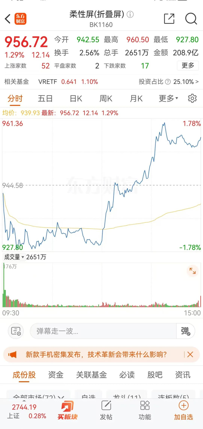 此次华为三折叠屏手机的发布,也让折叠屏概念股受到市场关注。9月10日午后,多只折叠屏概念股股价上涨,其中深天马A、大富科技等涨停,凯盛科技、德福科技涨超5%。