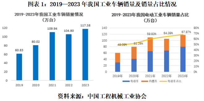 根据中国工程机械工业协会工业车辆分会近五年统计数据显示,2019年,我国工业车辆行业销量为60.83万台(含出口),2023年已达117.38万台(含出口),其间年复合增长率达17.86%。