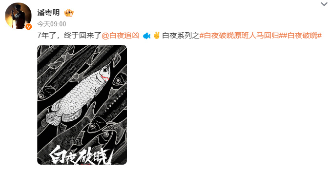 主演潘粤明也连发多条微博,称“7年了,终于回来了”,并戏言“我带着潘粤暗杀回来了”。