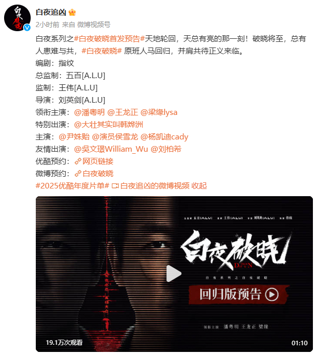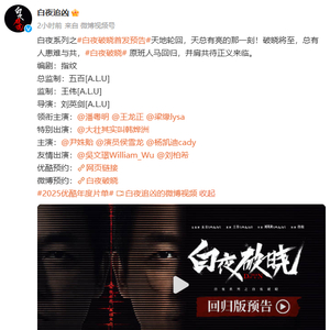 9月10日,电视剧《白夜追凶》官方微博发布消息,宣布白夜系列之《白夜破晓》原班人马回归。