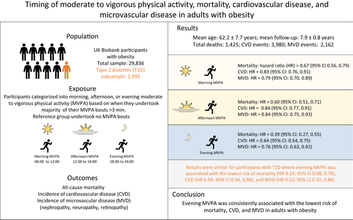结果发现,与对照组相比,晚上进行有氧中强度运动的人,心血管疾病、微血管疾病、全因死亡风险最低。