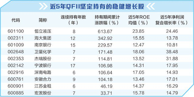 按照2019年~2023年净资产收益率持续高于10%,且近5年净利润复合增长率大于10%,统计QFII坚定持有的稳健增长股,共计有10只入选,包含卫星化学、杰瑞股份、宁波银行、深南电路等。