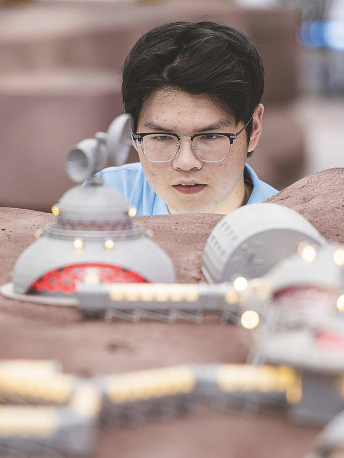 4月24日,2024年中国航天大会期间,一名志愿者在武汉国际博览中心参观火星基地模拟沙盘。 (央视)