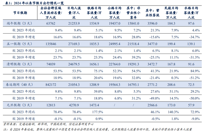 2024年各节假日的营业性出行方式中,基本上铁路日均客流量较2019年同期增速最快,且明显高于民航出行增速。从全社会跨区域人员流动量看,2024年以来各个节假日,民航出行的客流量较2019年同期均保持稳增;与2023年对比,五一和端午假期民航客流量在高基数情况下仍实现一定增长,出行需求表现较强。