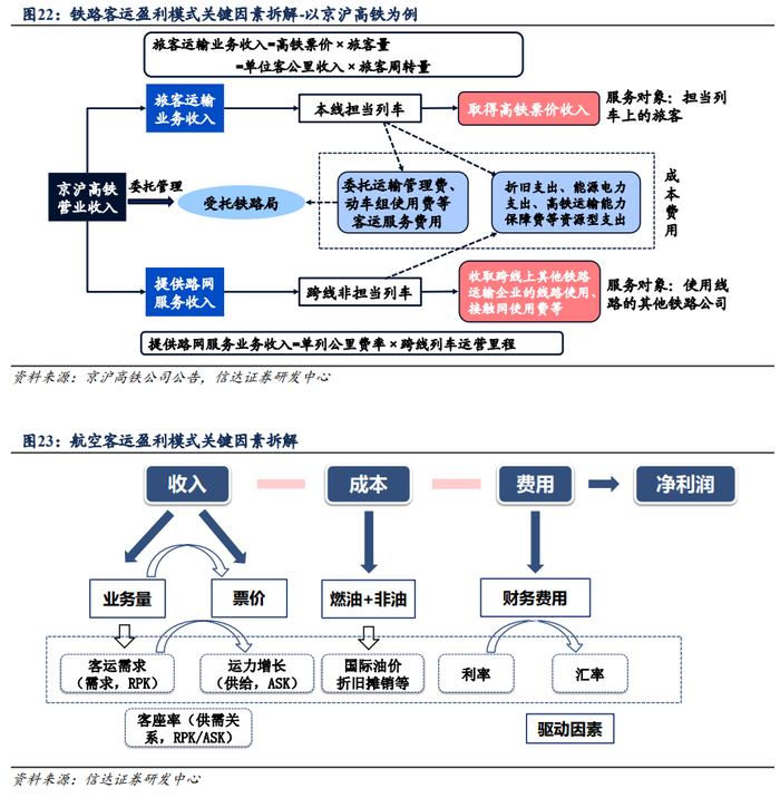 铁路客运公司收入及成本可控性较强,相对稳定;航空客运公司收入及成本影响因素较多。铁路客运企业收入源自公司担当列车的旅客票款收入以及其余铁路运输企业使用公司线路时缴纳的相应线路使用费等,票价市场化水平不高;成本则主要是线路及设备等服务费用、维护费用等,且定价标准多为国家部门指导定价。航空客运公司收入主要是航线旅客的票款收入,票价受行业供需关系影响,市场化程度高,票价变动灵活。成本及费用端则受到油价及汇率影响,影响程度及方向的不确定性较高。