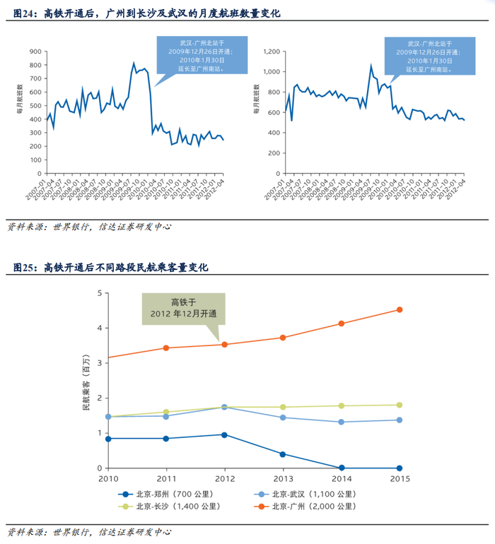 体线路看,以广州至长沙(约600公里)和广州至武汉(900公里)之间航线为例,高铁开通后,飞往长沙的航班减少约三分之二,飞往武汉的航班减少近一半。从北京至不同距离城市的路段表现看,高铁对北京-广州航线(2000公里航程)没有明显影响,航线客运量继续增长;对北京-长沙航班(1400公里)需求继续增长,但速度较慢;北京-武汉航线(1100公里)客运量略有下降;北京-郑州航线(700公里左右)客运量下降幅度很大。