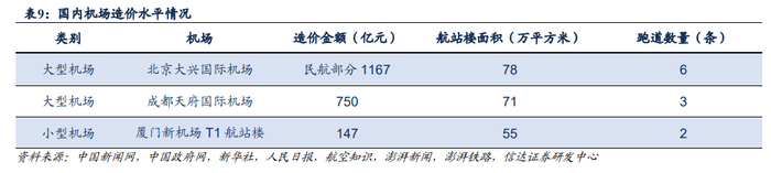 国内机场造价随规模大小从十亿至千亿不等,窄体机购置价约7~10亿人民币。机场造价方面,按照地理位置、机场规模、设计标准等价格有所不同。新建机场中,北京大兴机场民航部分投资达到1167亿人民币;厦门新建T1航站楼机场工程费用约147亿元;成都天府国际机场造价约750亿元。拥有较多支线机场的西部地区,单个机场投资约为10亿元,相当于10多公里高铁的价格;省内支线机场的造价一般在几亿至十几亿元人民币。