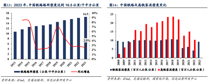 2.1.3客流需求:铁路网络密度仍有提升空间,高铁承运量高增速有望持续