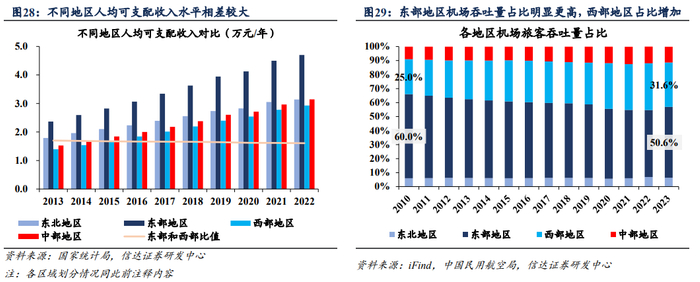 人均可支配收入与出行时间考量:虽然民航出行在1200公里以上行程路段基本占据主导,国内西部偏远地区机场数量占比也达到全国一半水平,但选择民航出行方式的旅客仍然主要集中在东部地区。受到可支配收入水平等因素影响,旅客选择出行方式时需衡量时间与票价的性价比问题,当前高铁票价水平显著高于机票,铁路客运出行竞争力更加凸显。此外,普通铁路列车仍有众多旅客群体,其票价为高铁票价1/3左右,普通列车旅客量约为铁路总旅客量的30~40%,一定程度上也印证了收入水平对出行方式选择的影响。
