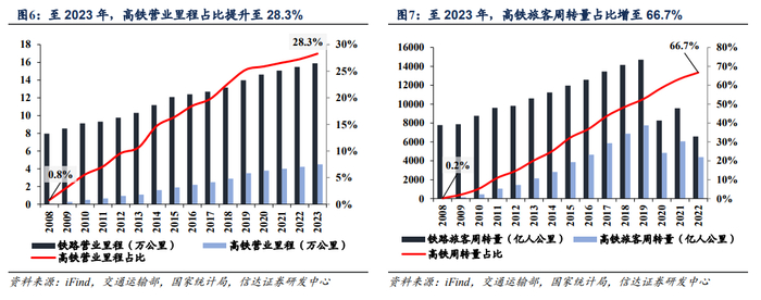2008年以来,铁路营业里程稳步增长,高速铁路营业里程快速攀升,高铁出行大众化普遍化的程度持续扩大。2008~2023年,铁路营业里程年均增速为4.7%,高速铁路营业里程年均增速高达32.0%。截至2023年末,铁路营业里程增长至15.9万公里,其中高速铁路营业里程增至4.5万公里,占比达到28.3%,对比2008年高铁营业里程占比0.8%提升显著。高铁在铁路中的旅客周转量占比从2008年的仅有0.2%快速增加至2023年的66.7%,铁路客运持续向高铁动车组转移,高铁客运运力实现高速释放。