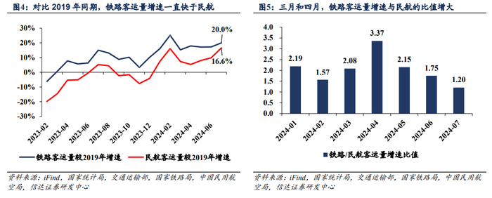 整体出行结构看,出行方式或偏向消费水平更低的高铁出行。出行结构看,铁路客运量增速整体快于民航,淡季期间二者差距加大。2024年3月和4月,铁路/民航客运量增速比值分别为2.08和3.37,比值扩大。商旅出行整体疲弱背景下,出行方式或也有结构性调整,民航出行转为消费水平更低的高铁出行。出行仍有需求,但出行消费水平下降。