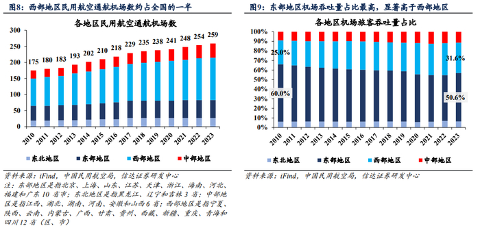 各地区机场分布与吞吐量占比不匹配,飞机运力增速显著放缓。对比不同地区机场数与旅客吞吐量的情况,至2023年,国内民用航空通航机场数增至259个,西部/东部/中部/东北地区分别有132/56/44/27个,东部机场数不到西部地区的一半;旅客吞吐量上,东部占比显著高于西部,二者分别占比50.6%/31.6%,其中西部地区吞吐量主要由云贵川等地贡献,贡献占比约60%。各区域间机场数与旅客吞吐量规模存在明显不匹配。飞机运力方面,2000~2023年,飞机运输架数由527架增至4270架,年均复合增速达到9.5%;2019年起,飞机运输架数增速明显放缓,运力提升变慢。
